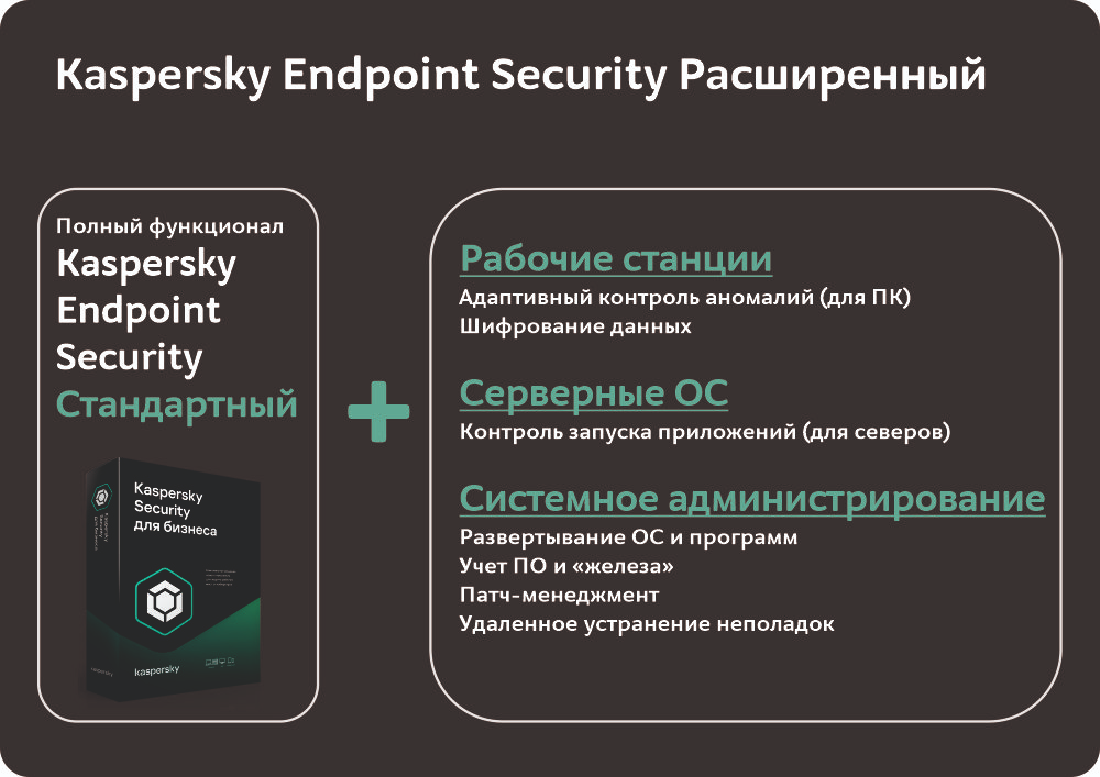 Согласитесь, что успех бизнеса во многом зависит от внедрения новых технологий, и IT-инфраструктуры предприятий становятся все более многоуровневыми. Это утяжеляет задачу управления всеми системами и обеспечения безопасности. Kaspersky Endpoint Security для бизнеса РАСШИРЕННЫЙ значительно упрощает выполнение целого ряда задач системного администрирования, экономя ресурсы компании и время администраторов.